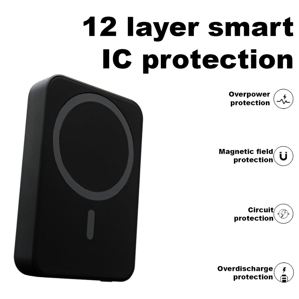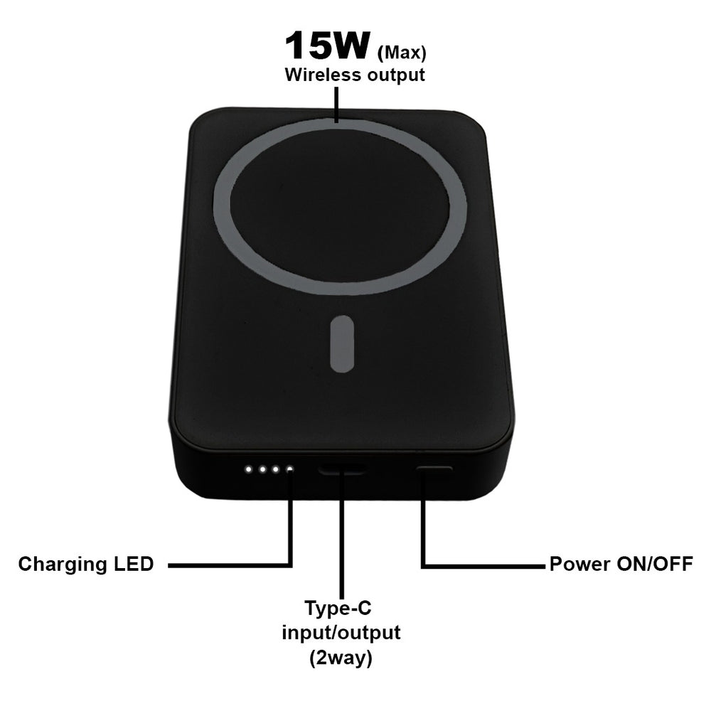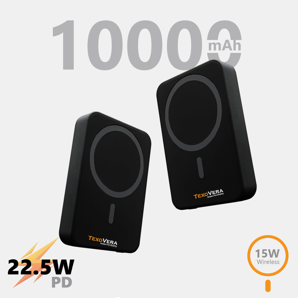The TexoVera 10000 mAh Wireless MagSafe Power Bank combines powerful portability with versatile charging options. Equipped with a 15W wireless MagSafe-compatible charging feature and a 22.5W wired output, it efficiently powers your devices on the go. Its lithium polymer battery ensures reliable, long-lasting performance, while the sleek black design offers a modern, professional finish. Perfect for professionals and tech enthusiasts who demand convenience without compromising power.